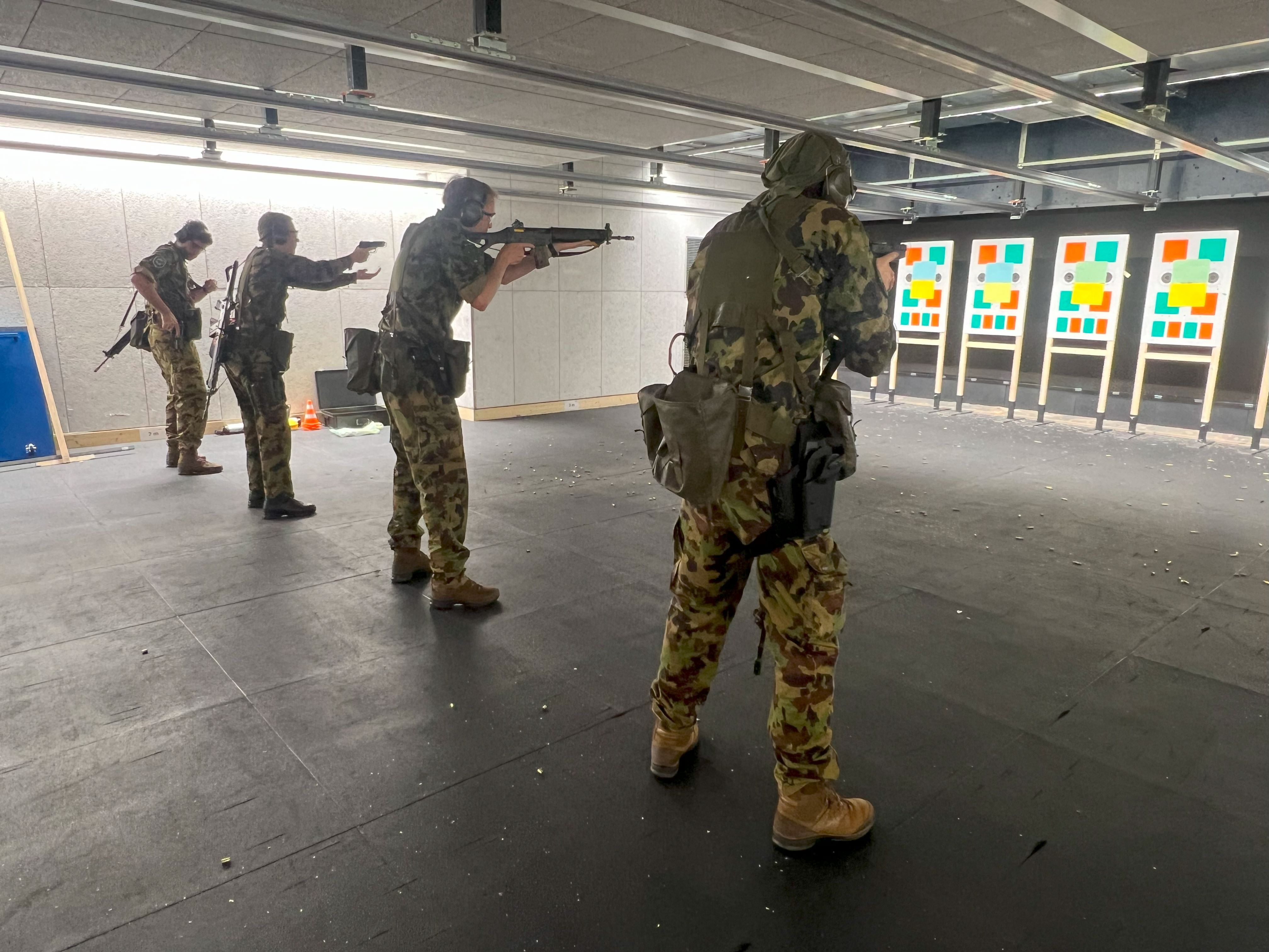 Festigung der Grundlagen an der persönlichen Waffe (Pist75 + Stgw90) auf der Schiessanlage Widstud in Bülach. Das Training findet u.a. im hochmodernen Schiesskino der Schiessanlage Widstud statt.
