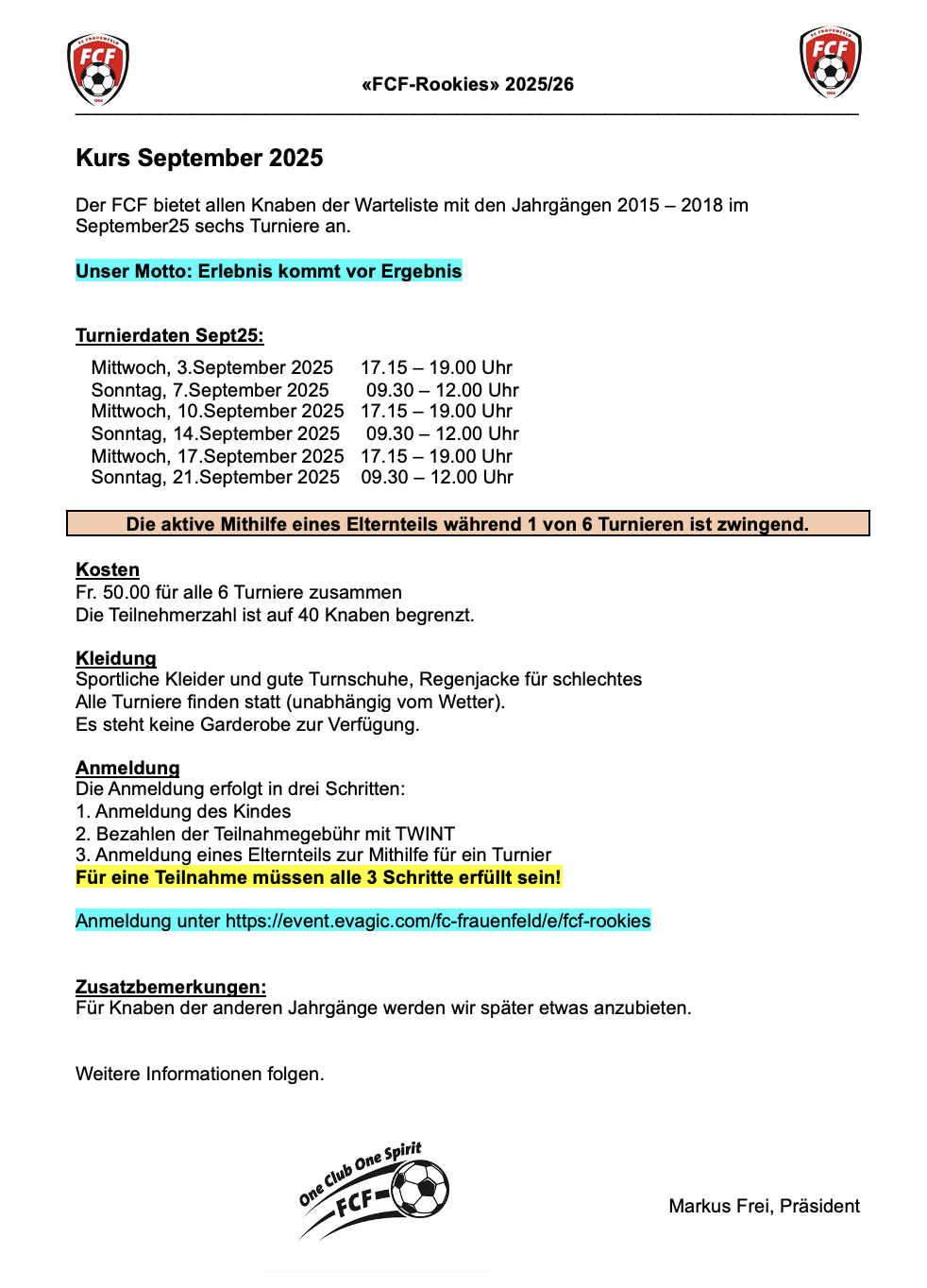 Wir starten im September25 mit einem Kurs mit insgesamt 6 Turnieren. Dieser erste Kurs ist reserviert für Knaben der Jahrgänge 2015 - 2018, welche nicht Mitglied des FCF sind.