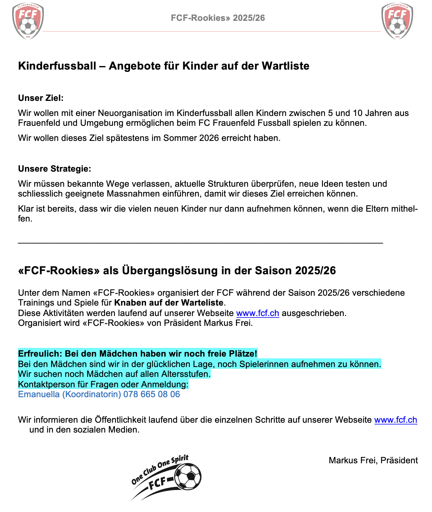 Mit dem Projekt “FCF-Rookies” wollen wir allen Kinder die Möglichkeit geben, sich in einem Training zu zeigen und den Eltern die Lösung des FCF für die Zukunft präsentieren.