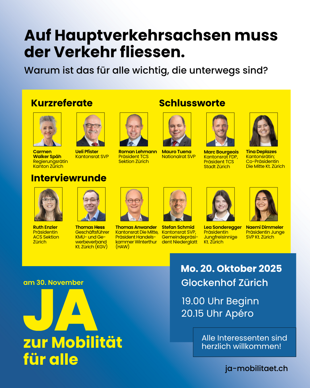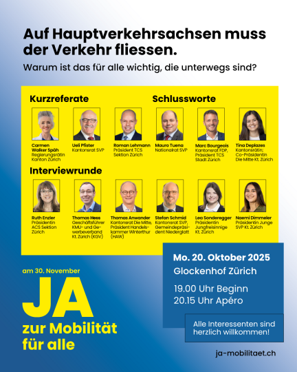 Die Mobilitätsinitiative lädt am Abend der Medienkonferenz zu einem öffentlichen Anlass mit spannenden Gästen und Einblicken in die Argumente hinter der Kampagne. Nach der Begrüssung durch Kampagnenleiter Ueli Pfister und Inputs von TCS-Präsident Roman Lehmann sowie Regierungsrätin Carmen Walker Späh folgt eine Interviewrunde mit Vertreterinnen und Vertretern aus Politik, Wirtschaft und Gesellschaft. Gemeinsam beleuchten sie die Auswirkungen der Initiative auf Verkehr, Sicherheit, Lebensqualität und kommunale Handlungsspielräume.