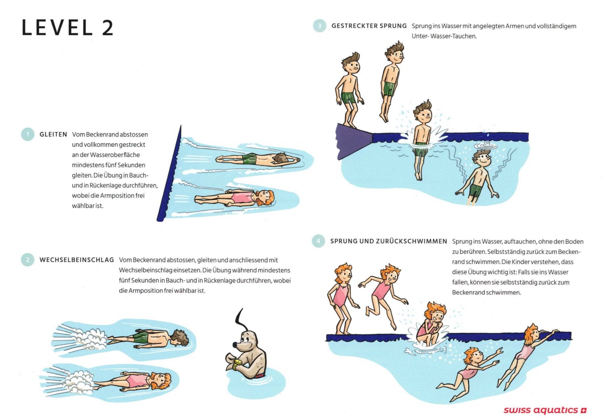• Freier Sprung ins Wasser; auftauchen, ohne den Boden zu berühren und selbstständig zurück zum Beckenrand schwimmen