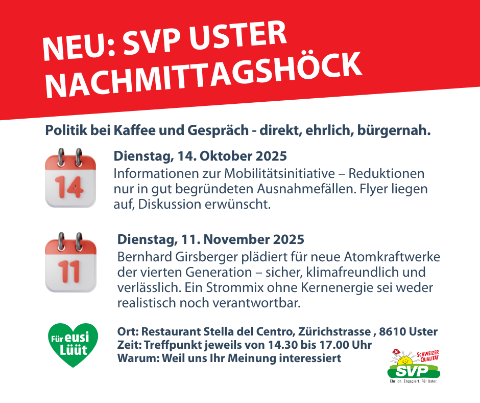 Auf vielfachen Wunsch führen wir neu den Nachmittagshöck ein – ein unkompliziertes Begegnungsformat der SVP Uster. Speziell für all jene gedacht, die abends lieber daheim bleiben, aber den Austausch mit unserer Partei und Gleichgesinnten schätzen.